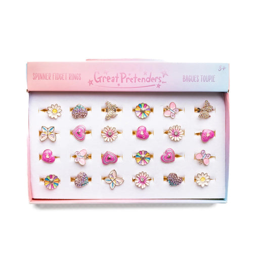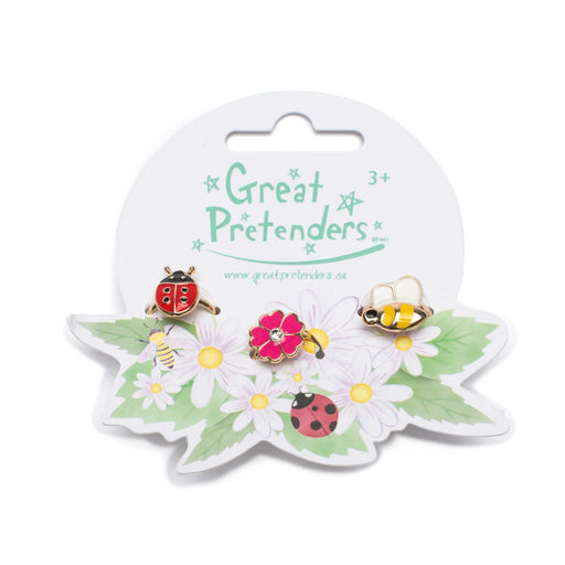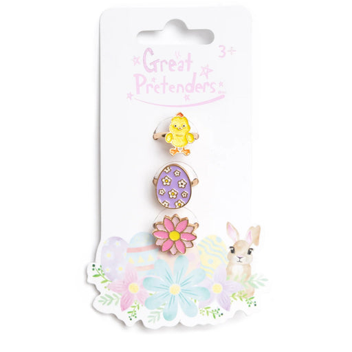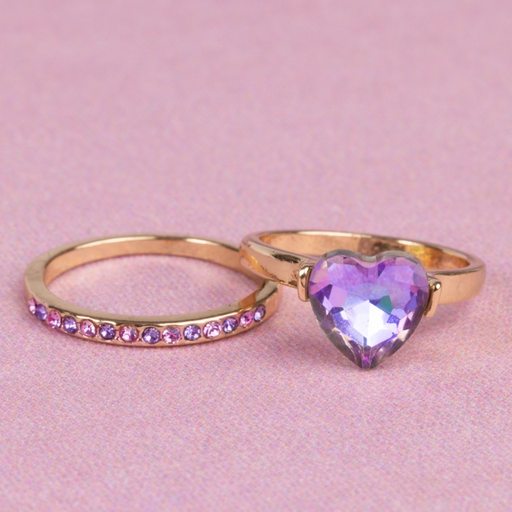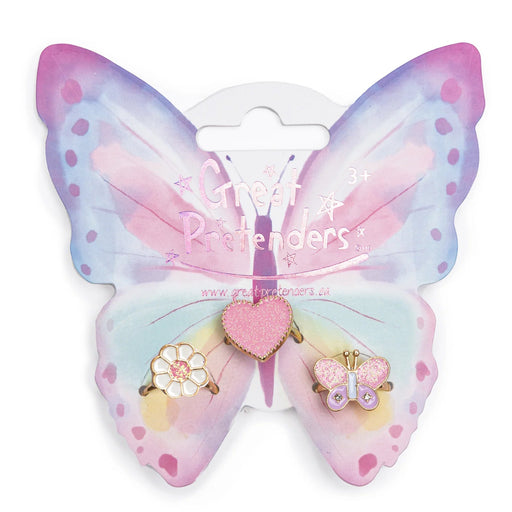 Three rose-gold toned rings made just for you! This adjustable set includes a shooting star, diamond, and triple heart-shaped ring for pretend play...