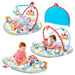 A 3-in-1 circus themed gym with many accessories. It has two plush figures - a funky monkey and a sweet elephant, a merry-go-round, and a large baby-safe mirror which can be hung or propped up on the mat.