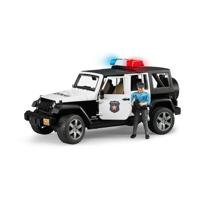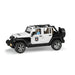 The Jeep Wrangler Unlimited Rubicon has been designed as a police vehicle and it provides countless functions to enable almost unlimited fun and games. In addition to the two-part, detachable segment roof, the bonnet, rear door and all four side doors open. The rear seat can be removed to create space for accessories compatible with BRUDER standard connectors in the loading area. The additional drag link is intended to facilitate steering through the roof hatch and if it is not required, it can be stored in the vehicle underbody. The axles feature typical off-road vehicle suspension and tread tyres with wheels in appealing SUV design. The front interface, suitable for items including the optionally available cable winch and the detachable drawbar coupling, means there are unlimited possibilities for enhancements in the world of BRUDER. The police version of the Jeep model features a newly developed light and sound module featuring four functional buttons (1. engine sound, 2. police siren, 3. fire service siren, 4. yelp signal). The bworld police officer is fully equipped to reinforce the authority. The waist belt features important tools for day-to-day police work, such as torch, radio device and truncheon.