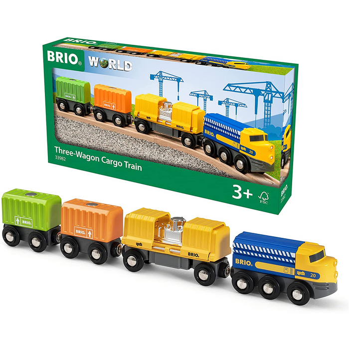 This brightly coloured toy train comes with three cargo wagons – two load wagons with orange and light green containers and a special yellow cargo wagon which holds a shiny new engine hidden behind its sliding doors. Featuring iconic BRIO magnetic connections, this cargo train is ready to connect to other BRIO World railway vehicles and wagons and get to work.