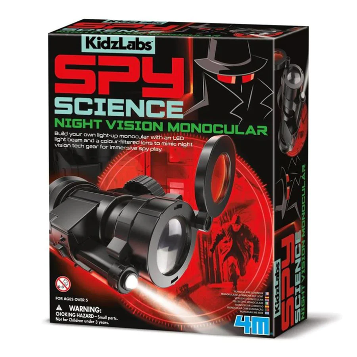 Build your own light-up monocular with an LED light beam and a colour-filtered lens to mimic night vision tech gear for immersive spy play. Turn on the light, use the knob to adjust focus, then look through the lens to see objects rendered 2X their normal size! You can even slide down the red-coloured lens to simulate night vision! Measures 4.25″L x 4″W. Requires 3 button-cell batteries (included). For ages 5 years and up.