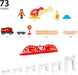 36114 Mega Spiral Set includes 73 pieces: 32x Modular Supports, 30x Wooden Tracks, 1x Long Red Bridge, 1x Battery Engine, 1x Loads Wagon, 1x Water Load, 1x Helicopter, 1x Firefighter Figure, 4x Fire Accessories, 1x Firefighter Sign.